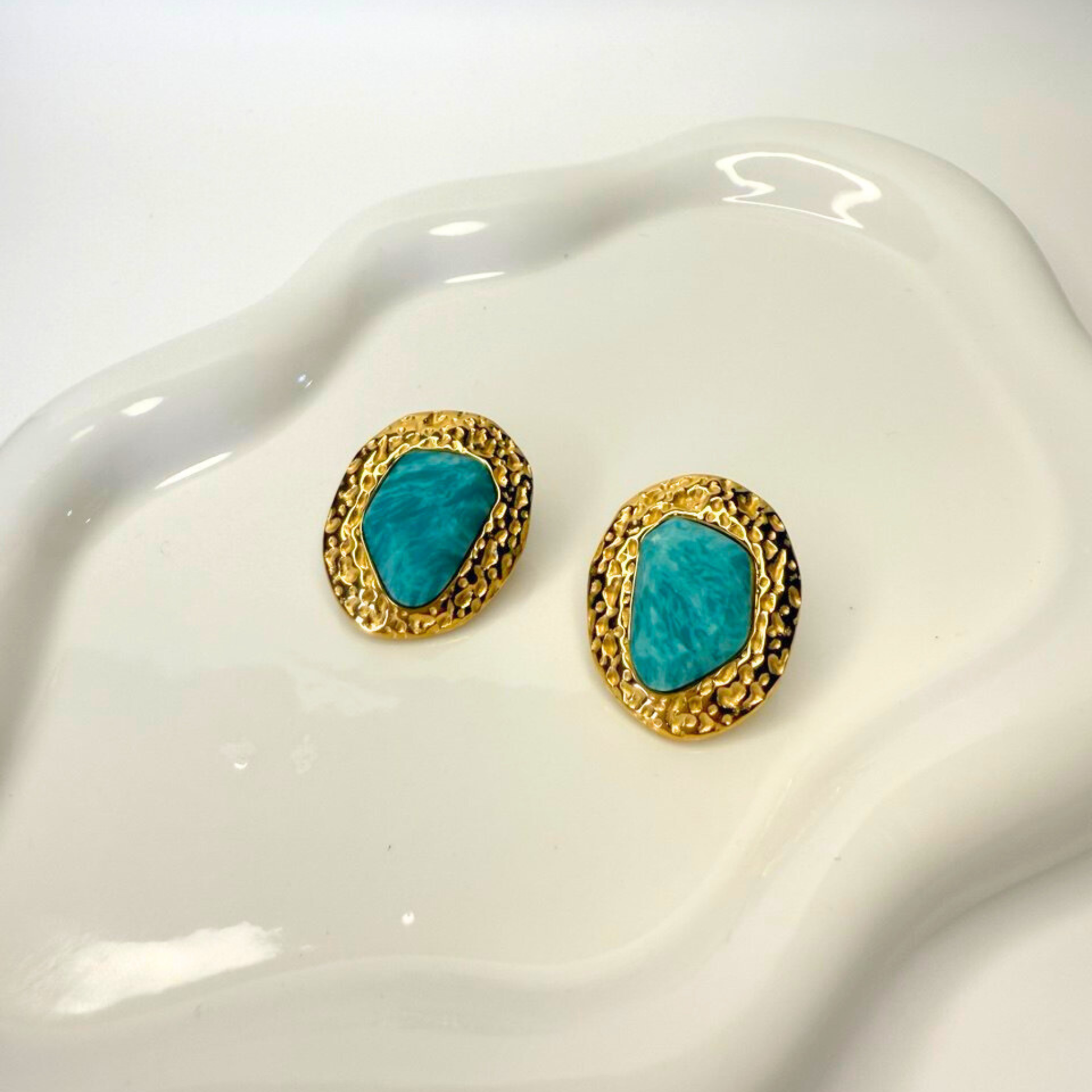 Each earring features an organically shaped, vibrant teal stone set in a rich, textured gold bezel. The metalwork has a distinctive hammered or 'nugget' finish, giving it an ancient, artisanal feel. These statement studs are perfect for adding a pop of color and an earthy, luxurious touch to any outfit, from casual wear to evening attire.