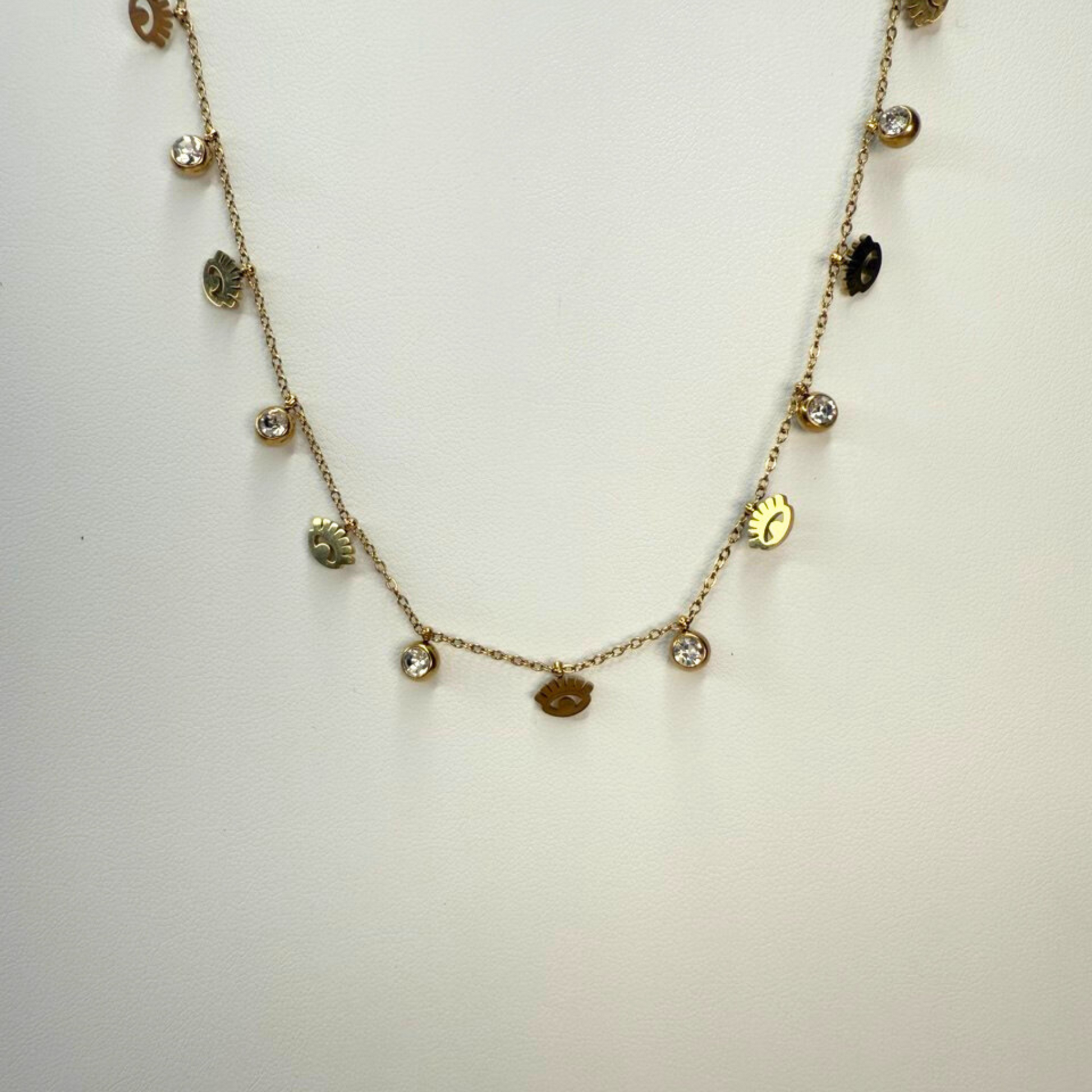This striking choker necklace features a bold, chunky chain adorned with multiple evil eye charms. These mystical amulets, known for their powerful symbolism of protection and good fortune, add a meaningful touch to the modern design. Perfect for those who want a piece that is both stylish and spiritually significant.