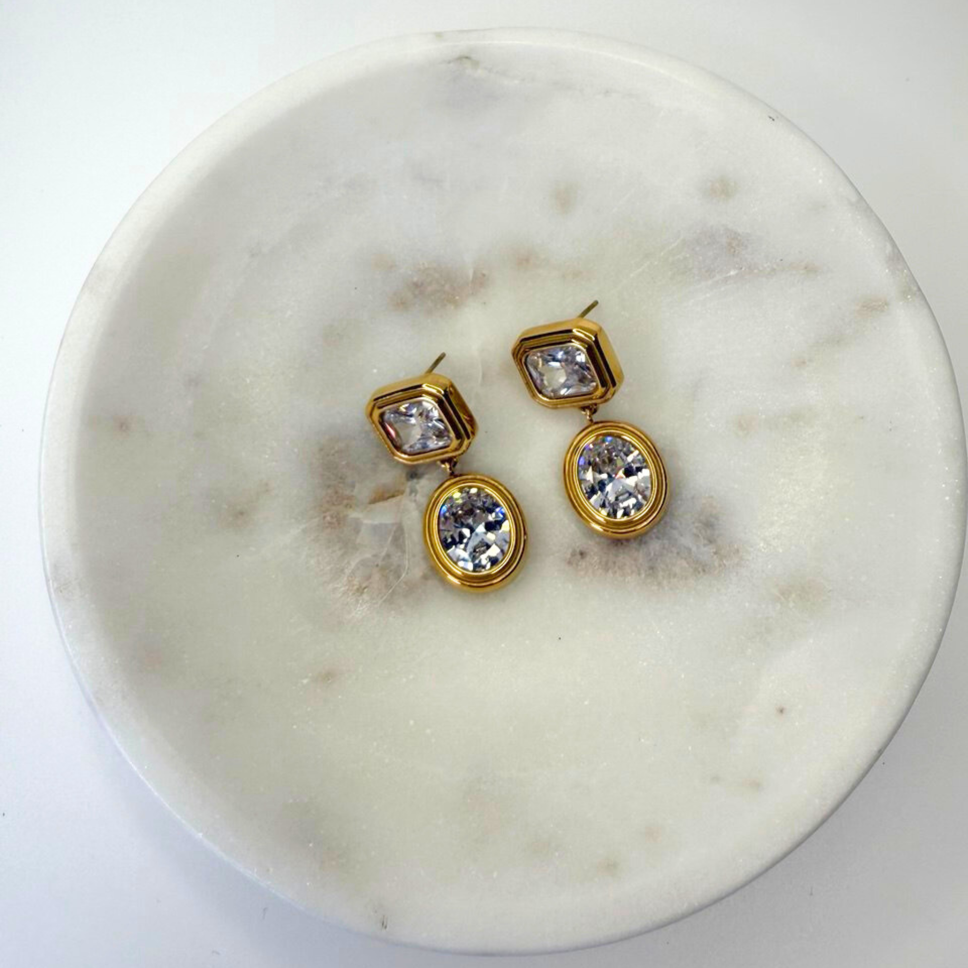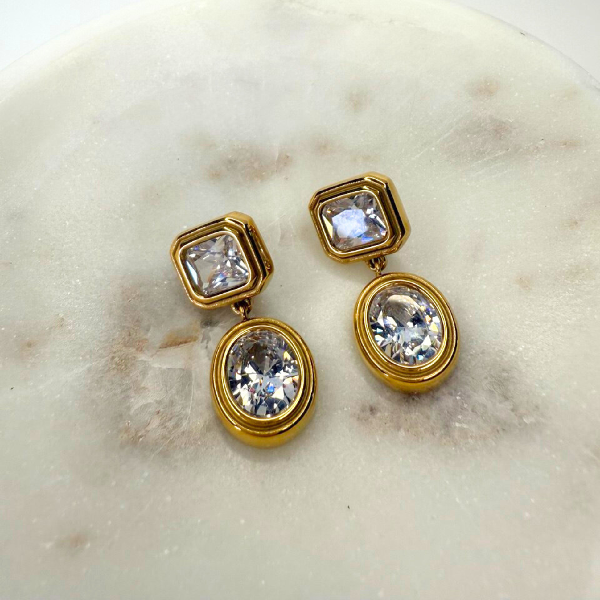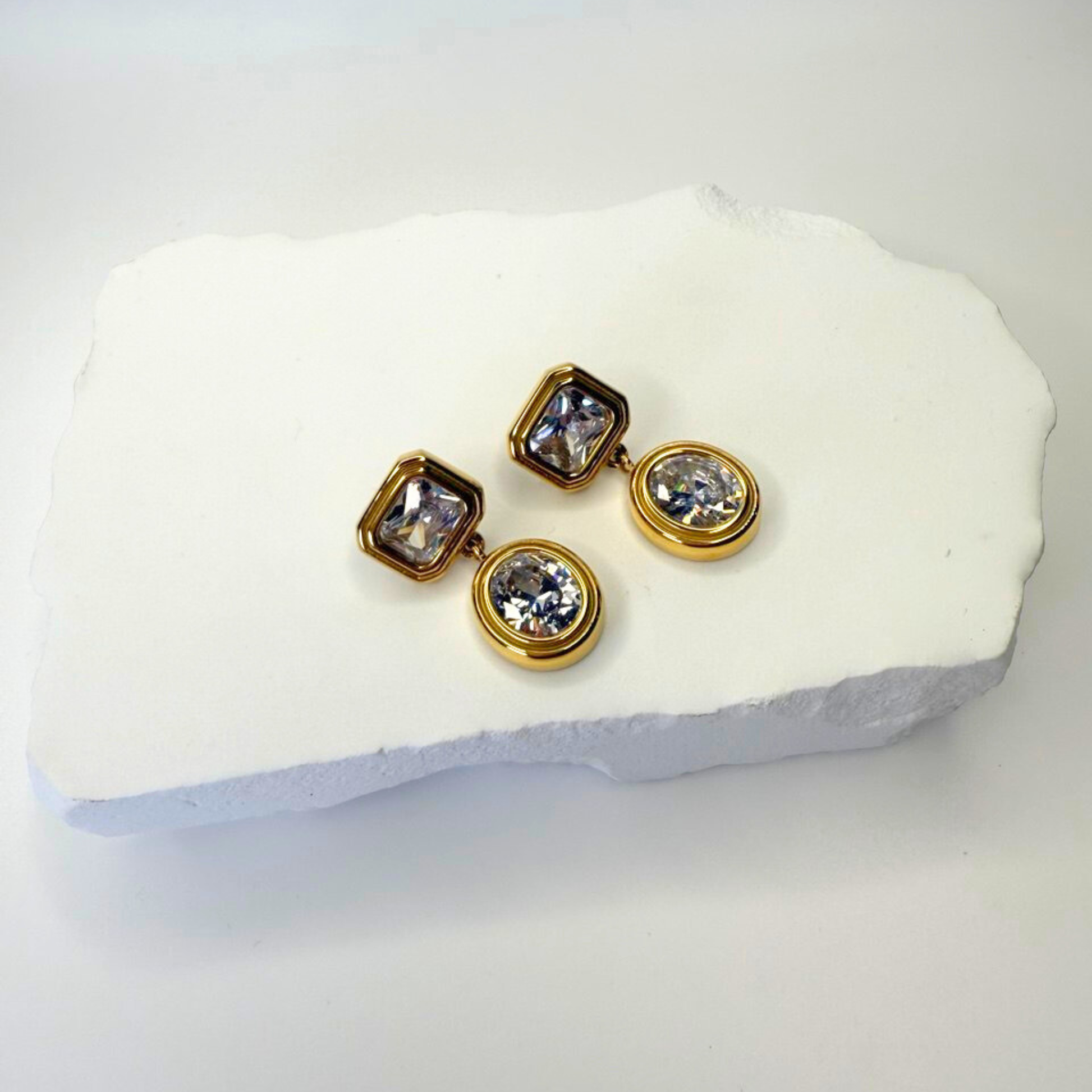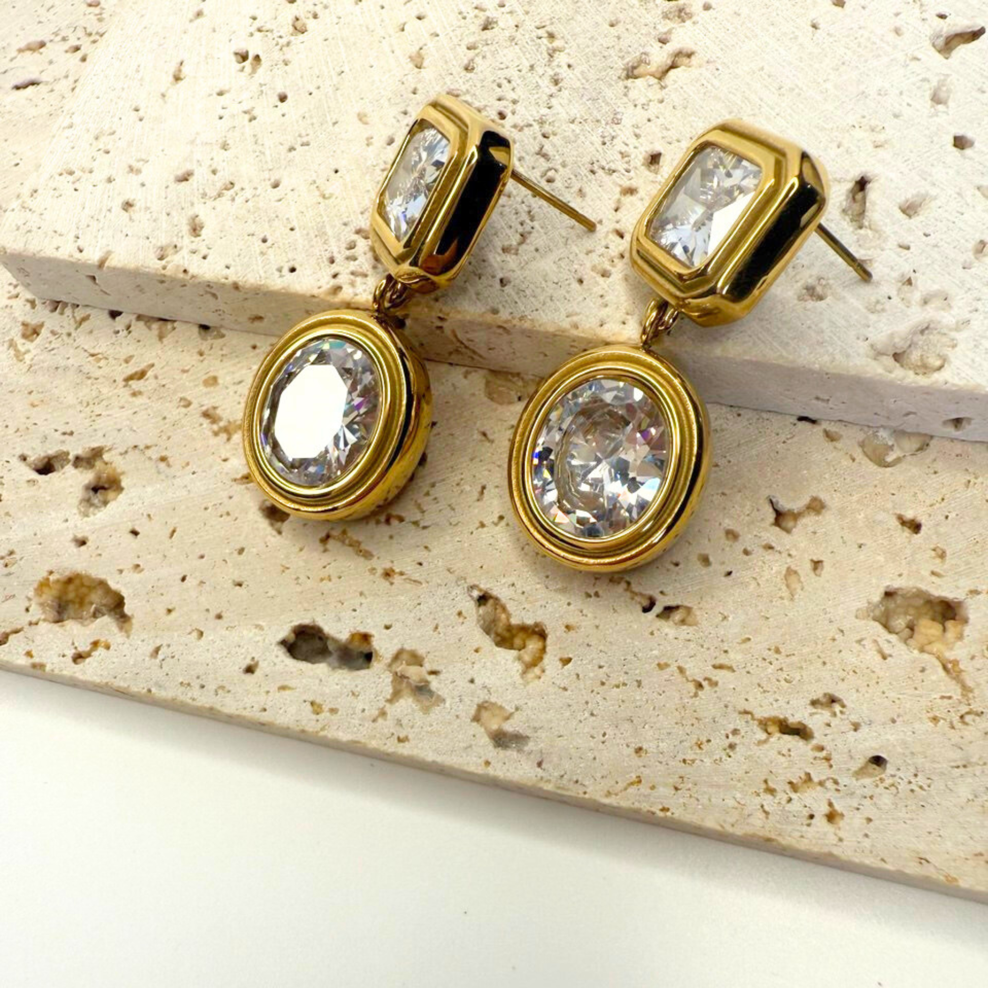Double-drop glamour at its best. These stunning earrings feature a brilliant rectangular cubic zirconia on top, leading to a large, dangling oval cubic zirconia, both set in a shiny gold-toned frame. They are the perfect statement piece for any special occasion.